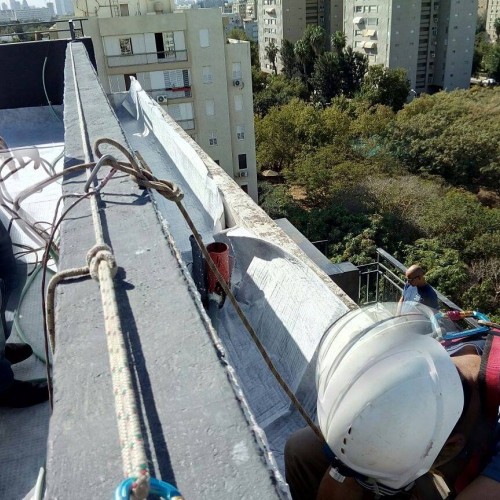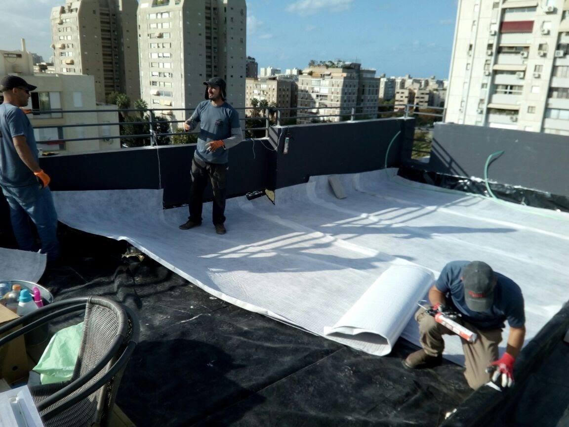אז הגענו מוקדם בבוקר עם השמש, לאחר בדיקת האיטום ובדיקת הצפה כמובן והתחלנו את התהליך של פרישת היריעות, להגנה על איטום הגג, ניקוז המים וסינון מצע השתילה, עליהם פרשנו את יריעות הצמר המינרלי, הצמר מאפשר שימור מים של עד 40 ליטר למטר, מה שמפחית את תדירות ההשקיה ומונע עומס על מערכת הניקוז של הבניין.