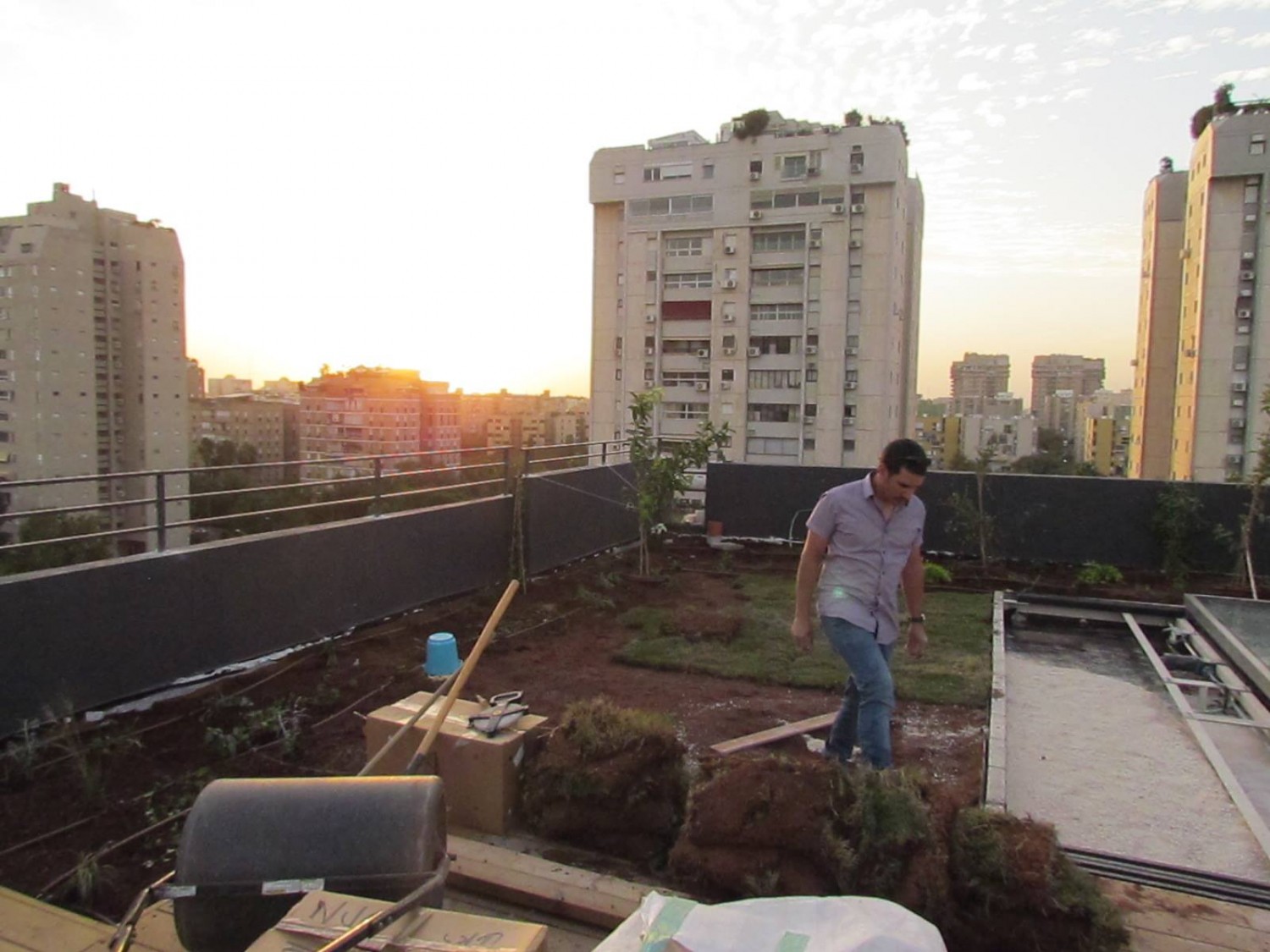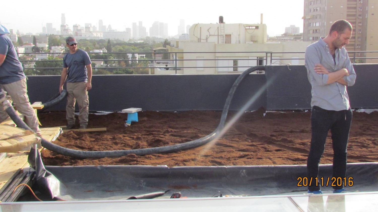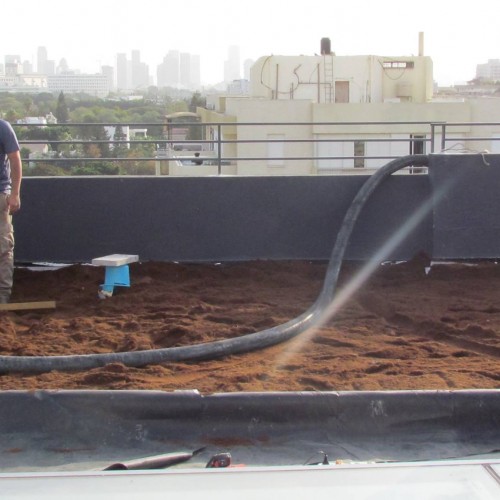 ביום שלמחרת העלינו ופיזרנו מצע שתילה לקומה תשיעית בקלות יש לציין, היות ואנחנו משתמשים בטכנולוגיה של הזרקה בצינור, זריז פשוט יעיל וקל. שתילות צמחייה ומערכת השקיה ממוחשבת